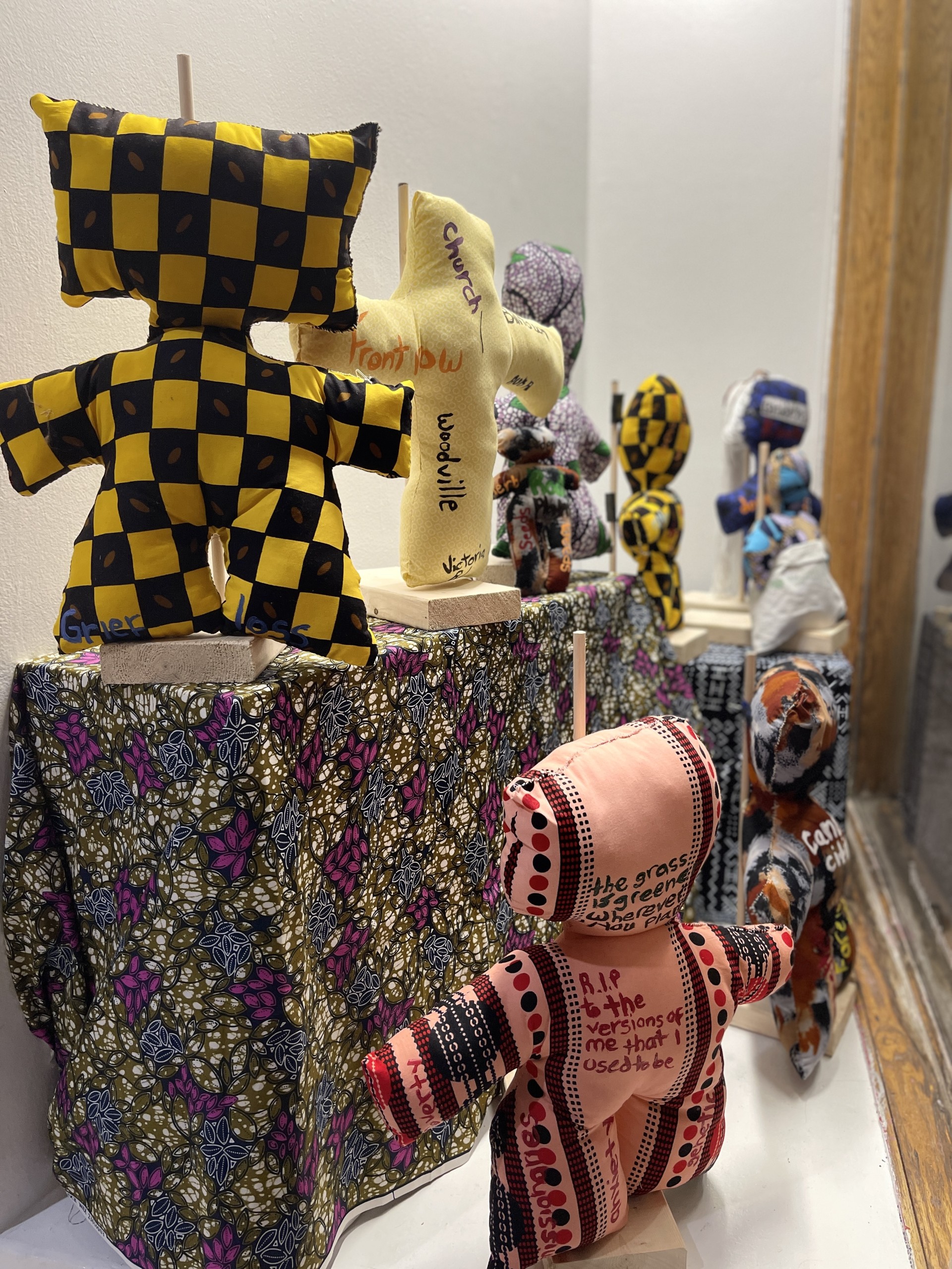 The doll at the Nocturne exhibit with “R.I.P. to the versions of me I used to be” painted onto its fabric, taps into the grief Mutale feels over not growing up in Africa, as well as missing the family she has there.